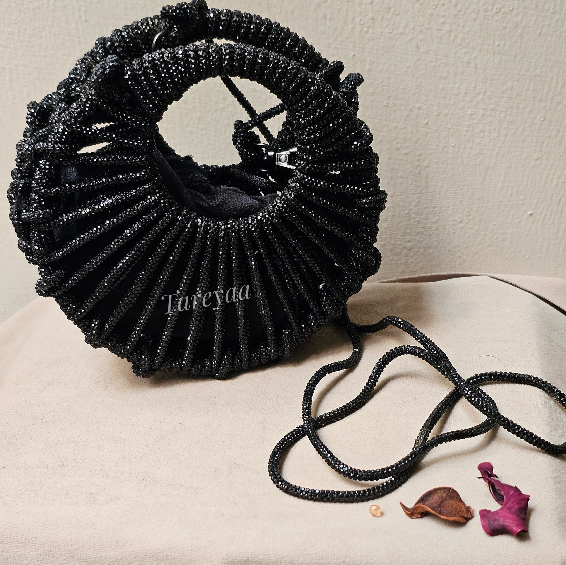 This sculptural party bag is more than just a statement. Hand-embellished with radiant rhinestone strings, it comes with a detachable sling for effortless glam. Inside, a mini potli adds a surprise twist — perfect for tucking away your tiniest treasures.