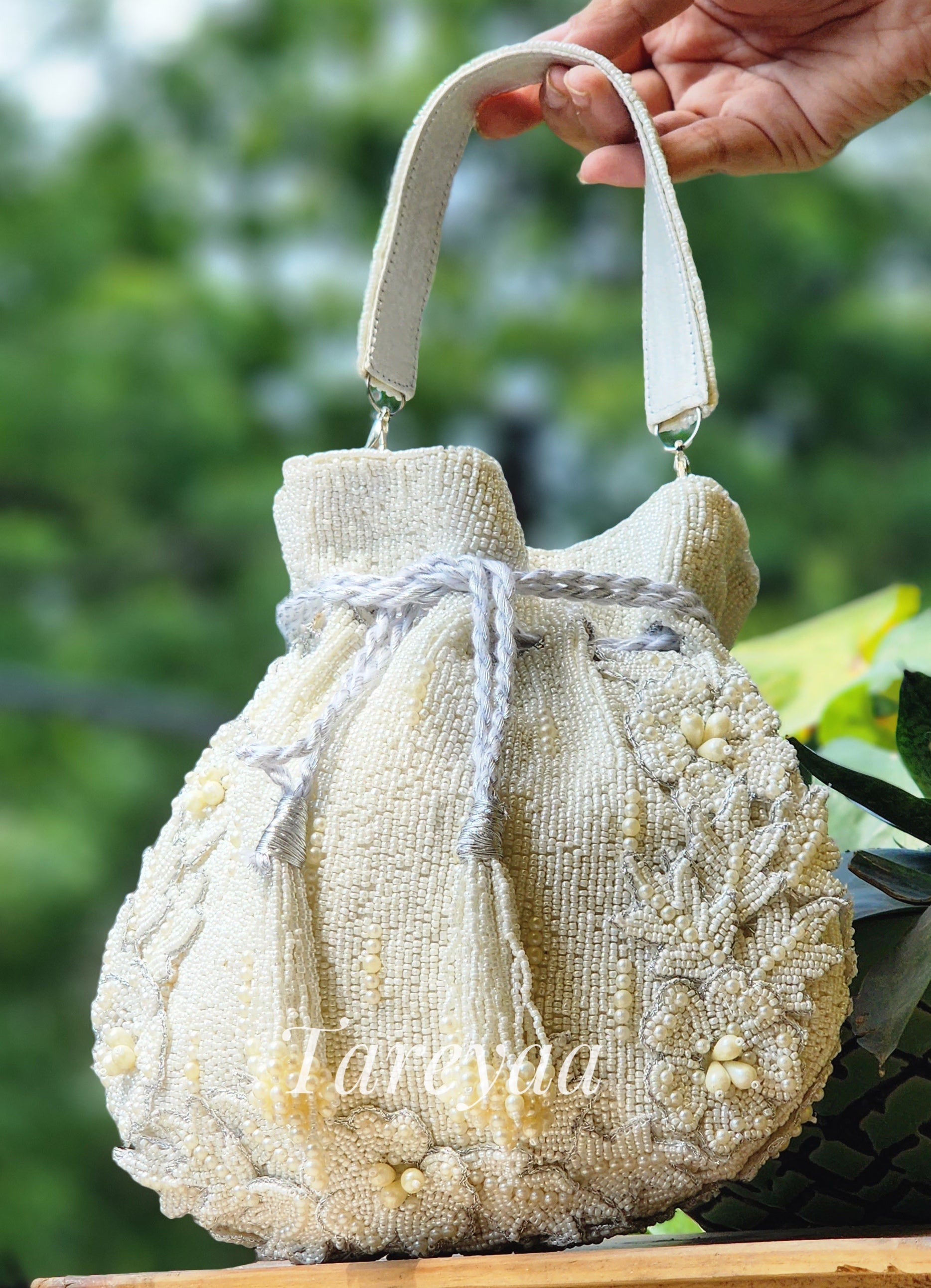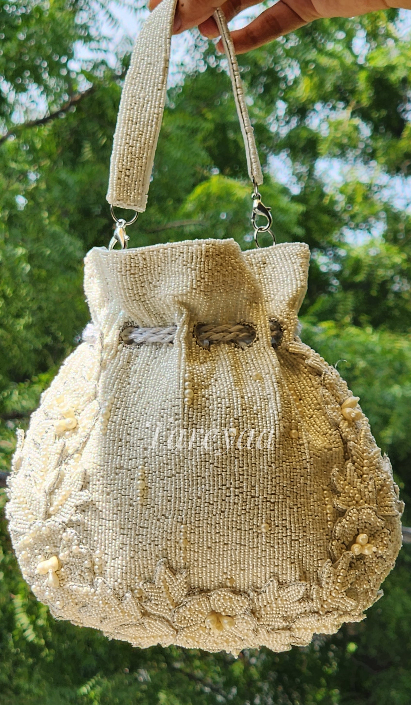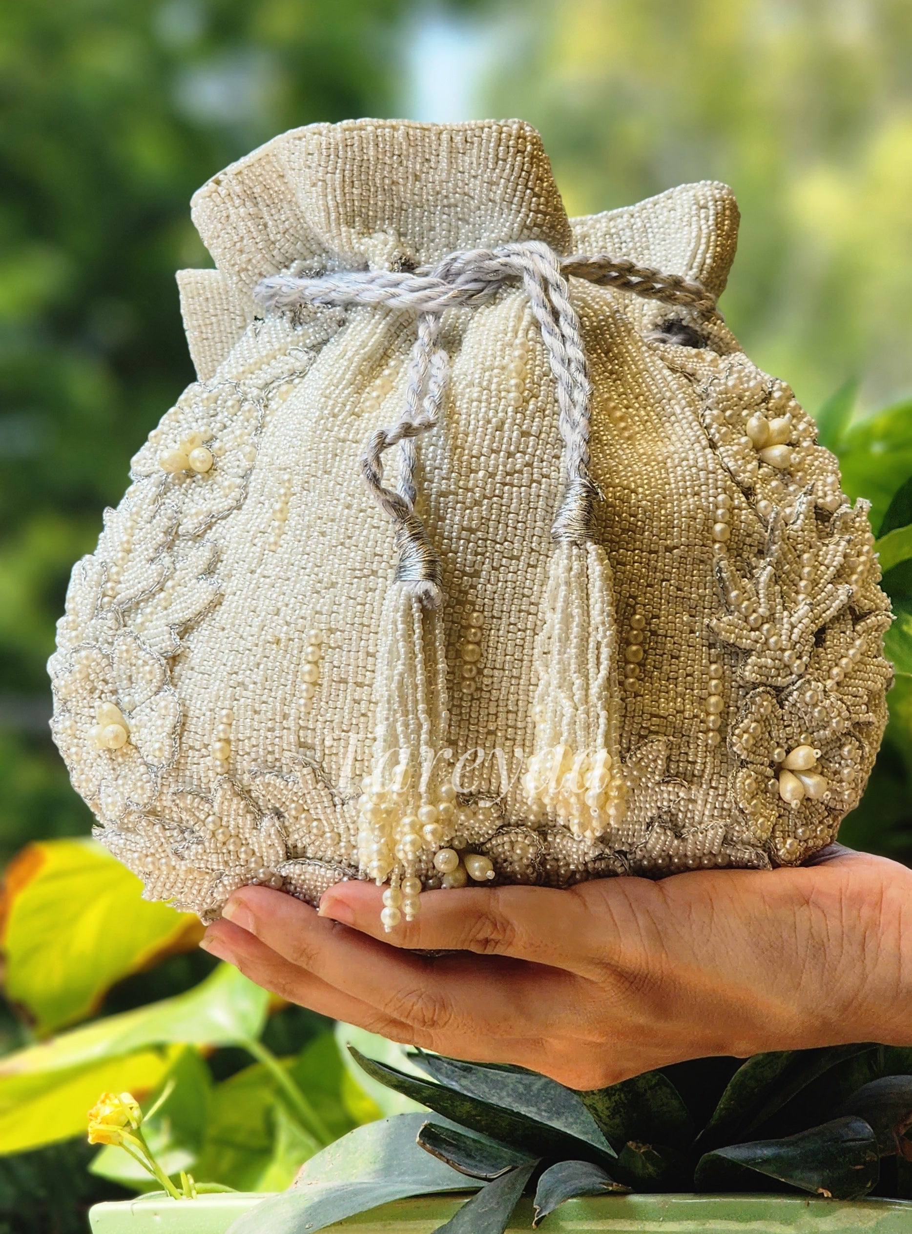 Elevate your ensemble with the opulent luxe potli, adorned with intricate lustrous pearls. The captivating design exudes a subtle allure, perfect for adding a touch of glamour to any outfit.